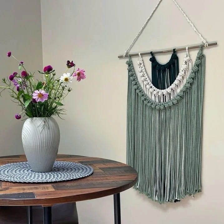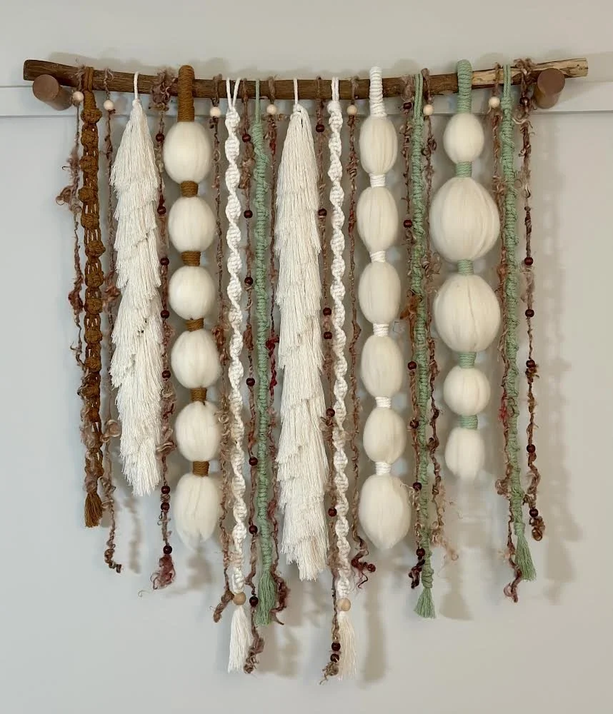 Macrame wall hangings range in size from 12” to 24” wide in various lengths. I create my designs from a selection of cotton cords, jute twine, merino, mohair, and alpaca wools, wood beads, bamboo rods, and other embellishments.